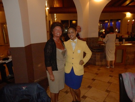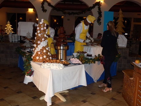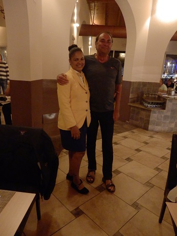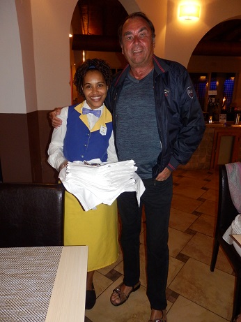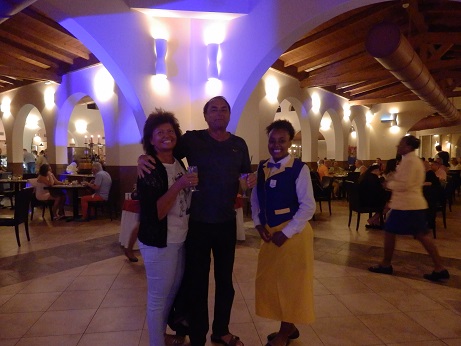 Ein Highlight ist das große Restaurant. Daneben gibt es noch zwei kleine. Hier wird gefrühstückt und abends gibt es ein oppulentes Buffet. Am Eingang gibt es einen Empfangsdrink, Sekt oder heißer Rum. Rum ist hier auf den Kap Verden ein Nationalgetränk und wird auch hier erzeugt. Mit seinem hohen Alkoholgehalt ist er brennbar, was beim Servieren noch interessanter wirkt. Dass er sehr schnell wirkt kriege ich an einem Abend relativ schnell mit, oder an dem Abend auch nicht. |