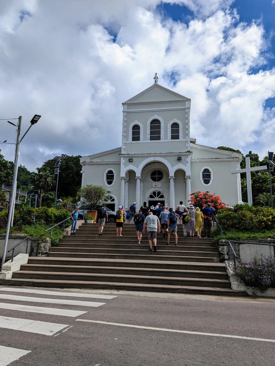 Victoria liegt an der Nordostküste Mahés, von steilen Berghängen eingefasst. Mit etwa 25.000 Einwohnern stellt Victoria die größte Ortschaft und einzige Stadt der Seychellen dar. Ihre Gründung geht auf französische Siedler im Jahr 1778 zurück, von den Briten wiederum erhielt sie ihren Namen, der ihr zu Ehren der Königin gegeben wurde. Links im Bild ist die Kathedrale unserer lieben Frau zu sehen. Daneben gibt es ein Priesterseminar. 80 % der Bevölkerung der Seychellen sind Katholiken. |
