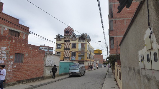 Die Rote Linie führt in Richtung El Alto, diesem jungen Stadtteil, in dem enorm gebaut wird. Wer wird dort wohnen, frage ich mich. Wandverputz und Farbe sind für den Großteil der Bevölkerung zu teuer und so sind so gut wie alle Häuser von La Paz unverputzt, die freiliegenden Ziegelwände tauchen die bebauten Steilhänge des Canyons und das Stadtzentrum in einen einheitlichen Rotschimmer. El Alto ist wohl offensichtlich nicht ganz ungefährlich. An der Endstation steige ich trotzdem aus und wandere ein Stück durch die Gassen. In einer Bank kann ich aus Bolivianos Dollars machen. Die Leute sind sehr freundlich und am Wechselkurs (Kauf/Verkauf) merkt man, dass hier Profit noch nicht so die Rolle spielt. |
