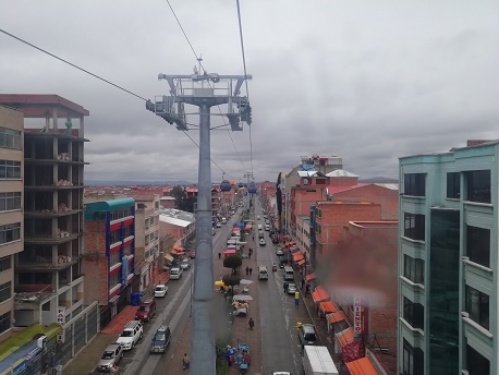 Ein quirliges Leben empfängt mich. Auch in La Paz viel Kolonialstil. La Paz ist die Stadt der Seilbahnen. Die Lage der Stadt im Tal zwischen den Bergen erfordert eigentlich diese von Österreichern erbaute Verkehrslösung. Also auf zur Seilbahn. Aber welche? Meine Vorstellung von einem Seil quer durch die Stadt wird glattweg ad absurdum geführt Es gibt ein richtiges Netz von Linien, durch Farben gekennzeichnet, welches auch offensichtlich ständig erweitert wird. Die rote Linie beginnt am alten Eisenbahnhof von La Paz. Ein zum Restaurant umgeformten Waggon erinnert daran. |