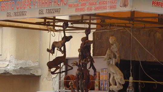 | Der nächste Tag beginnt mit einem Besuch des "Mercado Negro" (Schwarzmarkt) und des Mercado de las Brujas ( Hexenmarkt) Hier finde ich auch die berühmten Lamaföten, die angeblich in das Fundament von Neubauten gelegt werden, um den Bewohnern und dem Haus Glück zu bringen. |