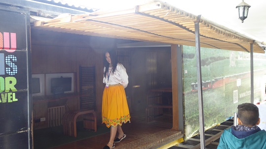 bei Quito. Teil der Präsentation ist dieser alte Eisenbahnwagen, der von einer jungen Dame erläutert wird. |