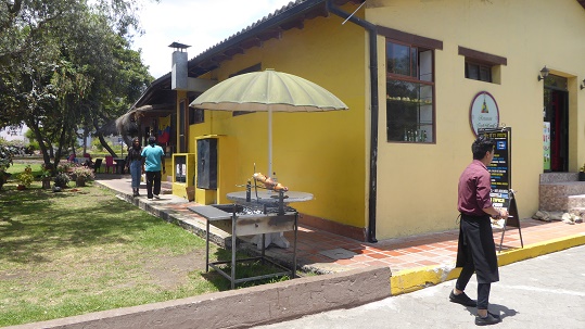 | Überall auf dem Gelände nette Gaststätten. Auf dem Grill vor dieser Gastivität grillen zwei Meerschweinchen vor sich hin. | ||