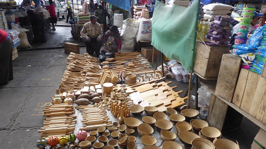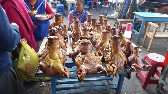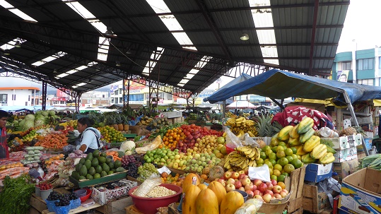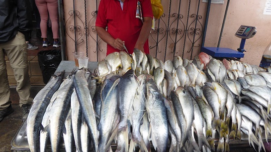 | Die reine Fahrzeit zum 170 km entfernten Krater von Quilatao soll etwa 3 h dauern. Der 50 $ - Ausflug startet wieder morgens um 7°° Uhr vom Plaza Foch. Das heißt, um 6°° Uhr aufstehen und 20 Minuten vom Hotel laufen. Patricio leitet und Hector fährt. Bei dieser Tour gibt es kein Frühstück, dafür einen Besuch eines lokalen Marktes. Angeboten werden Früchte, Gemüse, Fleisch und Fisch. Die Vielfalt allein der Kartoffeln ist erschütternd. Es gibt 300 verschiedene Sorten, klein bis ganz groß. |