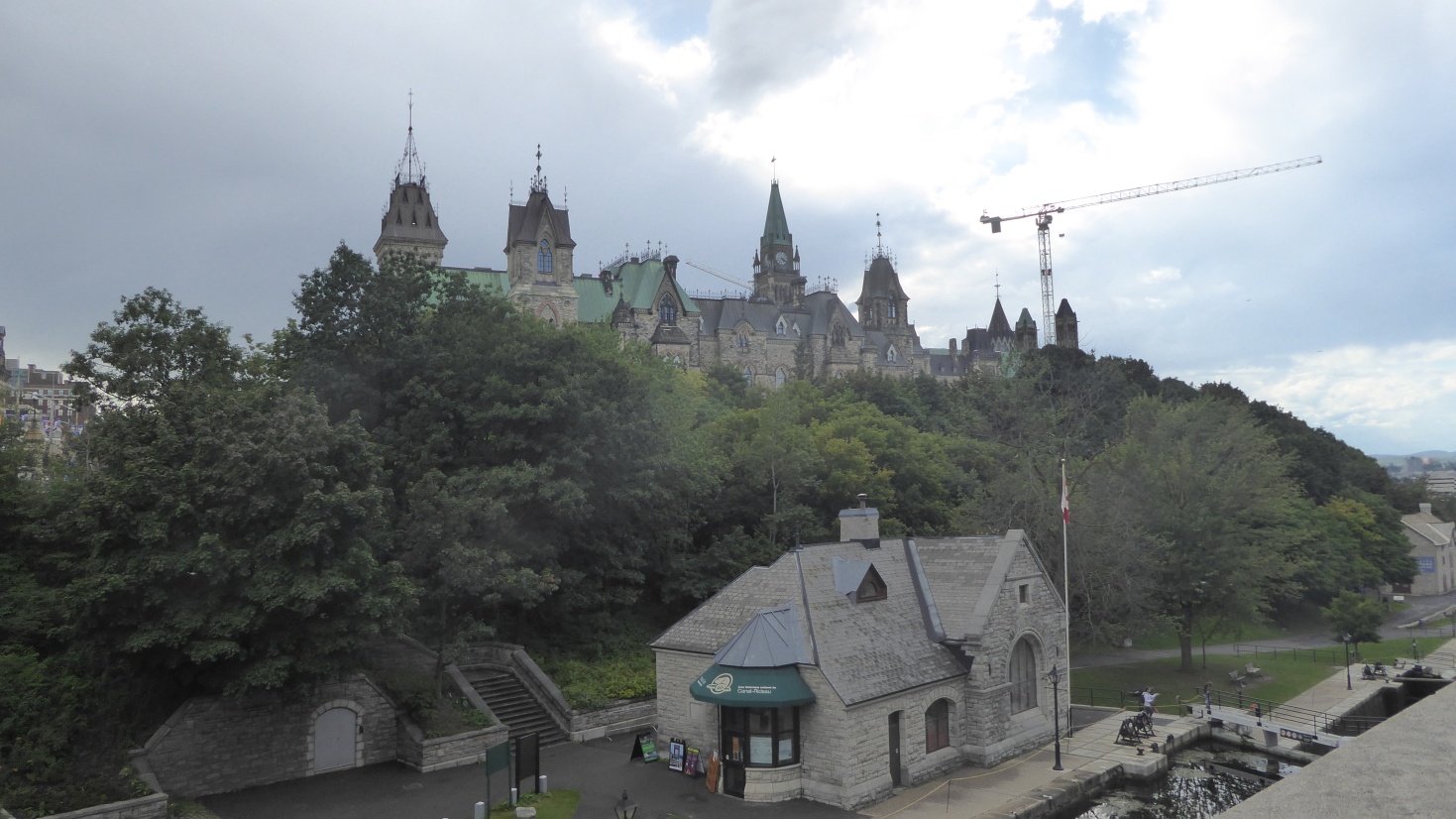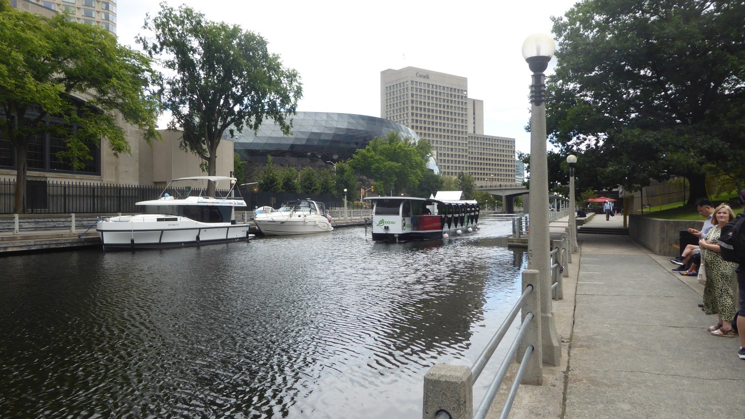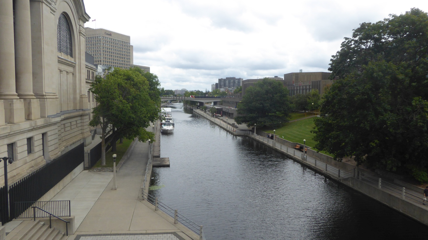 Das Chateau Laurier ist eines von Kanadas bedeutendsten Eisenbahnhotels; erbaut im Neorenaissance-Stil im Auftrag der Grand Trunk Railway; aufgrund der Nähe zu Parliament Hill scherzhaft auch als „dritte Parlamentskammer“ bezeichnet. ![]() Der Rideau Canal wurde vom britischen Militär nach Kingston gebaut und 1837 fertig gestellt. Er sollte eine sichere Versorgungsroute im Kriegsfall zu ermöglichen und wird heute touristisch genutzt und ein UNESCO-Welterbe. Wir fahren am zweiten Tag mit einem Elektroschiff auf ihm. Im Winter kommen in Ottawa schnell mal -40 °C zustande. Dann friert der Kanal restlos zu und wird zum Eislaufen genutzt. |