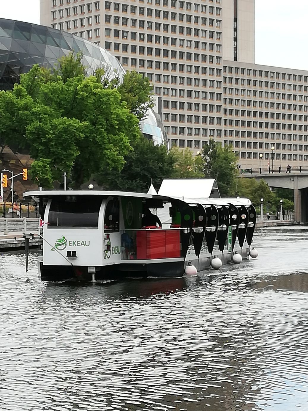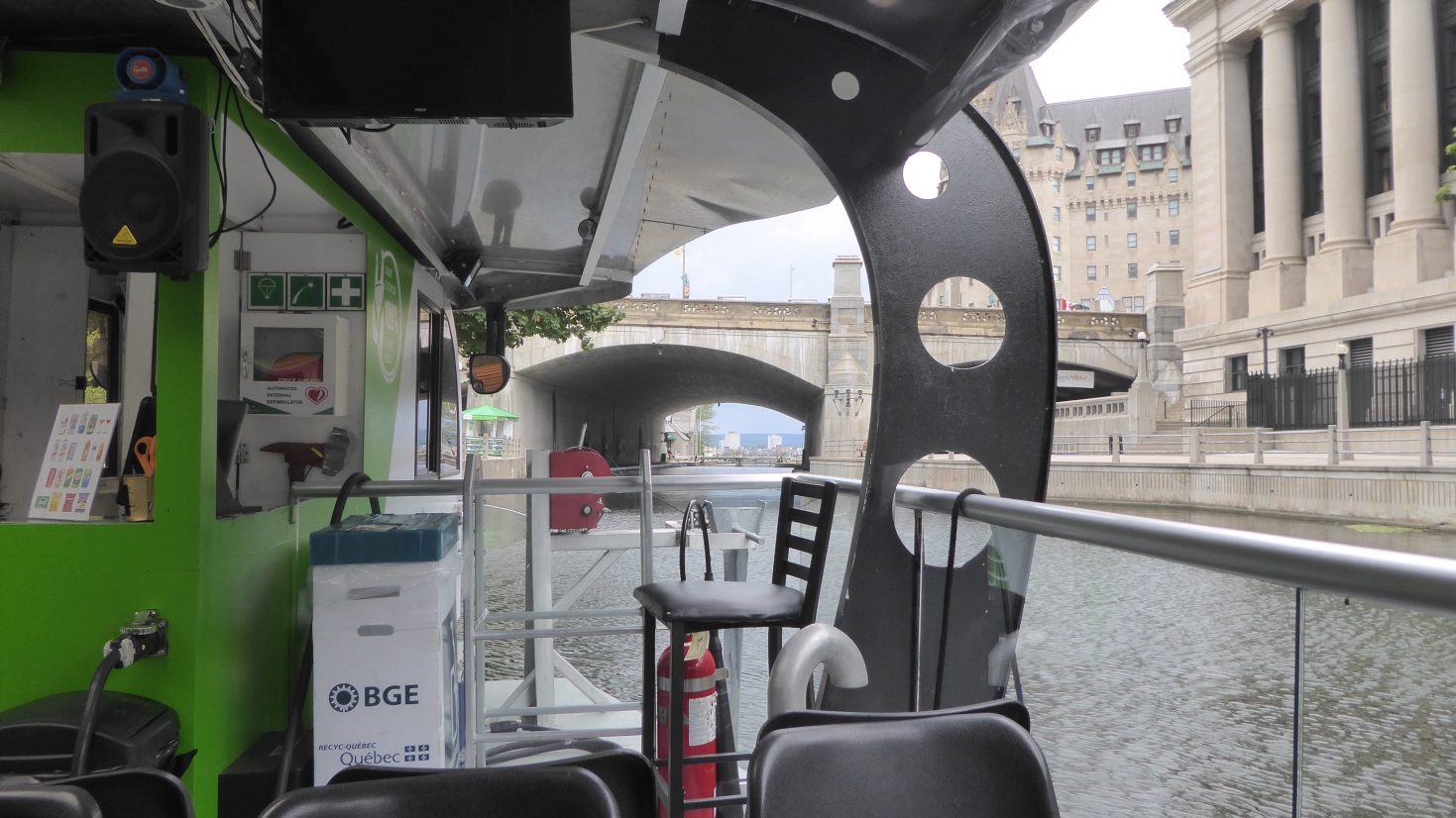 Nach dem Ende der Rundfahrt warten wir auf unser Elektroschiff, das uns einen Teil des Rideaukanals hinunter schippert. Die Fahrt versinkt leider buchstäblich in einem unbeschreiblichen Regen. |