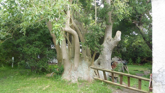| Ca. 30 km von La Paloma liegt der Wald der Ombubäume. Man findet diese Pflanzenart auch unter dem Begriff Zweihäusige Kermesbeere oder englisch „Elephant Tree“. Sie wächst in der Pampa Südamerikas. Botaniker streiten um den Begriff Baum, denn diese Pflanze lässt sich bequem mit einem Messer zerteilen. Die hellgraue Borke wird im Alter rissig. |