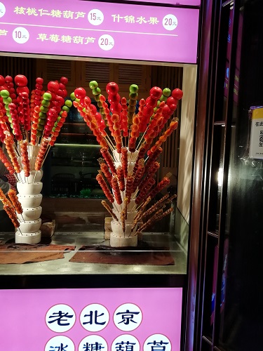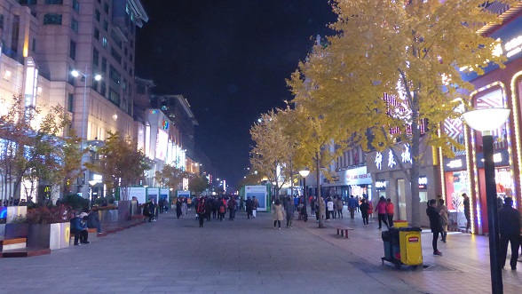 mich unterscheidbar.![]() Hinter diesen Spießen verbergen sich unter anderem kandierte Süßkartoffeln, schmeckt nicht schlecht. Das letzte Essen für mich an diesem Abend. Etwas hungrig gehe ich ins Bett, an das Essen muss ich mich erst noch gewöhnen. Vielleicht machen Schilderungen von Hunden und Katzen im Zusammenhang mit chinesischer Küche etwas zu misstrauisch. ![]() Nachdem etwas von den Köstlichkeiten (links) konsumiert wird, gibt es ein Straßentraining. Der Bus fährt uns ins Hotel mit einem Abstecher zum bestens illuminierten "Platz des ewigen Friedens". Ein absolutes Schauspiel. Leider kein Halt und Fotos durch die Fensterscheiben sind sinnlos. |