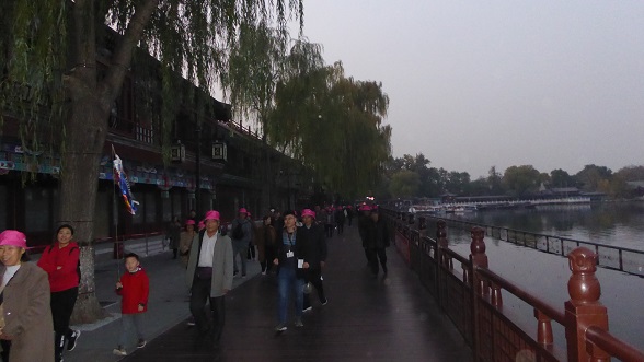 | Außerdem schlägt uns Herr Huang einen Abendspaziergang durch Peking vor, 15 Euro, auch sehr zu empfehlen. Der Bus Bus fährt quasi ins Zentrum Bejings und dort am Rand liegt eine altes Viertel an einem See. Von jetzt ab geht's zu Fuß weiter. Alles sehr schön, vielleicht Disneyland, aber egal. Von Zeit zu Zeit folgen Erläuterung. | |||