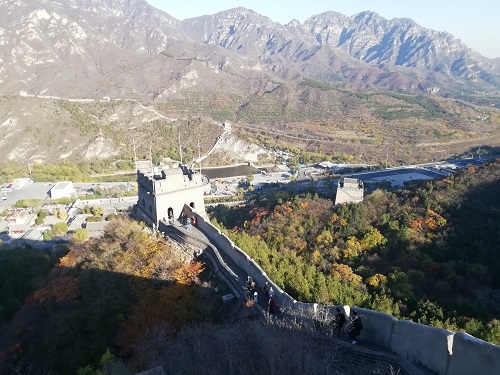 ![]() Vom Flugzeug aus kann man die Meur beim Landeanflug auf Bejing gut sehen. Sie windet sich durch das Land, weil sie eigentlich nur auf den natürlichen Gebirgszügen aufsitzt und sich an ihnen orientieren muss. Die eigentlich Mauer ist nur 4 bis 7 m hoch, jedenfalls an den Stellen, die wir besichtigen. |