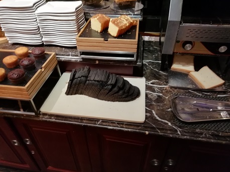 Abreisetag. Zum Frühstück gibt es unter anderem schwarzes Brot mit der Konsistenz von Weißbrot. |