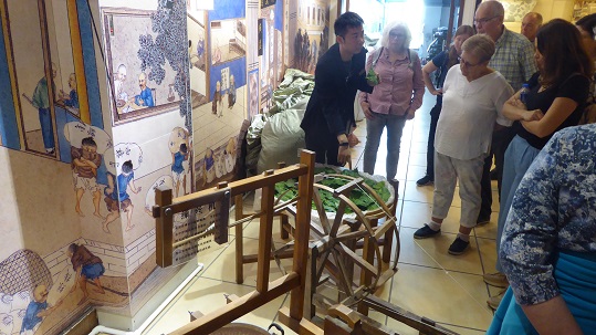 Auch bei dieser Tour darf etwas Kommerz nicht fehlen. Stört aber nicht, führt auch ohne Geldausgaben und neuen Erkenntnissen. Also, Seidenraupen fressen Maulbeerblätter und Puppen sich dann ein. Das Ergebnis heißt dann Kokon. bereits um Der Seidenbau hat seinen Ursprung in China, wo Seide2800 v. Chr. produziert worden sein soll. Heute ist China der weltgrößte Produzent von Rohseide. Die größte Bedeutung unter den seidenspinnenden Insekten kommt dem Echten Seidenspinner zu. 95 % der Naturseide werden von diesem gewonnen. Der Seidenfaden wird direkt aus dem Kokon gewonnen, nachdem die Raupe mit Dampf getötet wurde. Die Kokons kann man auch auseinander ziehen und erhält ein Rechteck von immenser Festigkeit. Die werden dann übereinander gelegt und weiter gedehnt, so dass große Decken entstehen, die dann als Füllung dienen. |