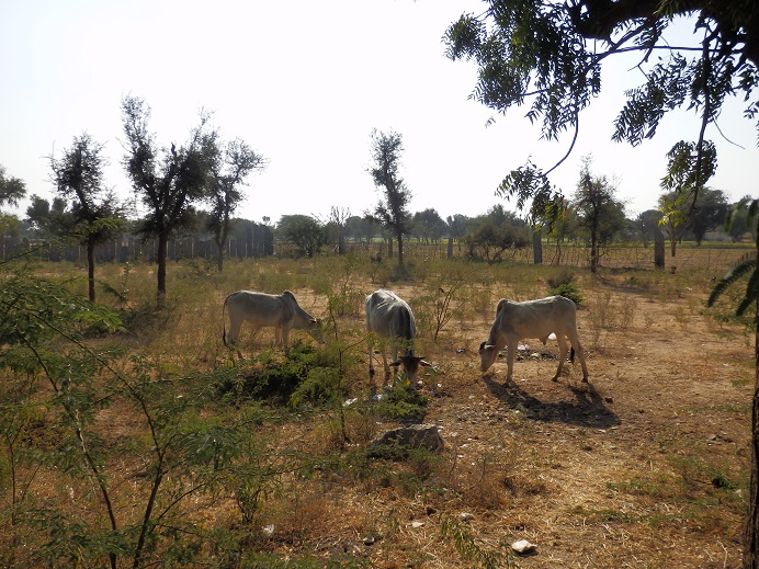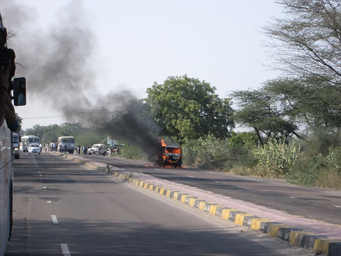 Auf der Strecke nach Jodpur halten wir an einer Raststätte. Einfach, aber alles gepflegt und sauber. Bei der weiterfahrt kommen wir an einem brennenden Auto vorbei. Auf der Fahrt halten wir ab und zu an, um die Landschaft einzufangen. |