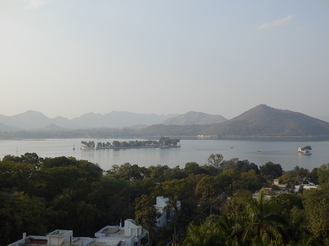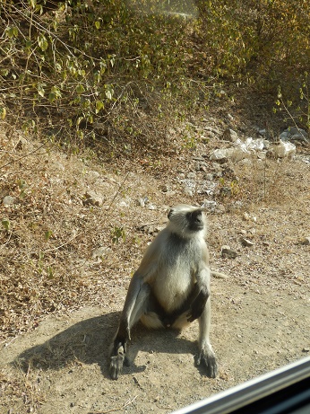 | Wir erreichen am späten Nachmittag Udaipur und eine Märchenwelt tut sich auf. Udaipur liegt im Aravalligebirge in einer Höhe von ca. 570 m ü. d. M.. Die Stadt ist umschlossen von drei künstlich angelegten Seen, Pichhola-See, Fateh-Sagar-See und Udai-Sagar-See. Affen sind allgegenwärtig in Indien, why not. Link: Blick vom Hotelzimmer auf den Pichhola-See. |