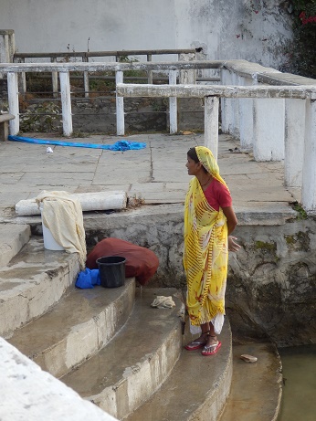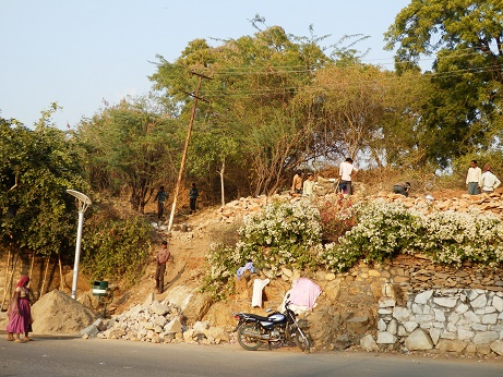 Wir machen noch einen kleinen Trip Richtung See, mit Pferdekutsch für 100 Rupien = 1,20 Euro. Da tun sich noch einige Motive auf, die klischeehafterweise von vielen als "indientypisch" angesehen werden könnten. Wir fotografieren, eine Meinung maßen wir uns nicht an. Im Bild oben tragen vorwiegend Frauen Baumaterial in Eimern auf dem Kopf zu einer Baustelle auf einem Hügel. |