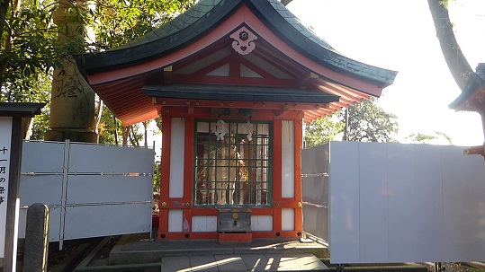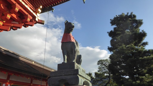 Am Eingang des Schreins sind zwei Füchse als Figuren. |