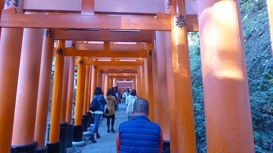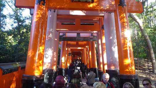 Am Nachmittag geht es zum Fushimi Inari Schrein. Er ist einer der etwa 40000 Inari Schreine des Landes, wurde 711 gegründet und ist 5 Shinto-Gottheiten gewidmet. Leider haben wir für diesen sicher sehr interessanten Weg keine Zeit. |