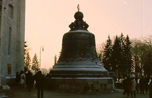 ![]() Die 6,14 Meter hohe Zarenglocke, die ebenfalls am Iwanplatz an dessen Kreuzung mit der Borowizki-Straße auf einem speziell gefertigten Sockel steht. Auch sie wurde kein einziges Mal ihrem eigentlichen Zweck nach verwendet. Die Glocke wurde im Jahre 1735 vom Gießermeister Iwan Motorin und seinem Sohn Michail gefertigt. Dazu wurde an speziell aufgebauten Schmelzöfen rund 200.000 kg Metall aufbereitet, wobei ein Großteil davon Reste einer 1655 hergestellten und 1701 bei einem Brand abgestürzten Glocke waren.I m Jahre 1737 kam es im Kreml zu einem Großbrand. Die Glocke wurde vom Feuer erfasst, erhitzte sich und zersprang schließlich, als kaltes Löschwasser auf sie gelangte. |