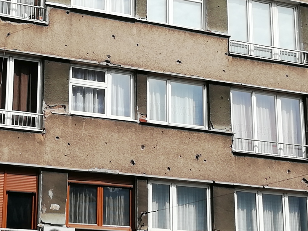 Während der Belagerung wurden etwa 11.000 Menschen (darunter 1.600 Kinder) getötet und 56.000, teilweise schwer, verletzt. Hauptursache waren Heckenschützen. An vielen Gebäuden sind die Spuren ders Kampfes noch zu sehen. An diesem Gebäude haben die Fensterscheiben bestimmt nicht überlebt. |