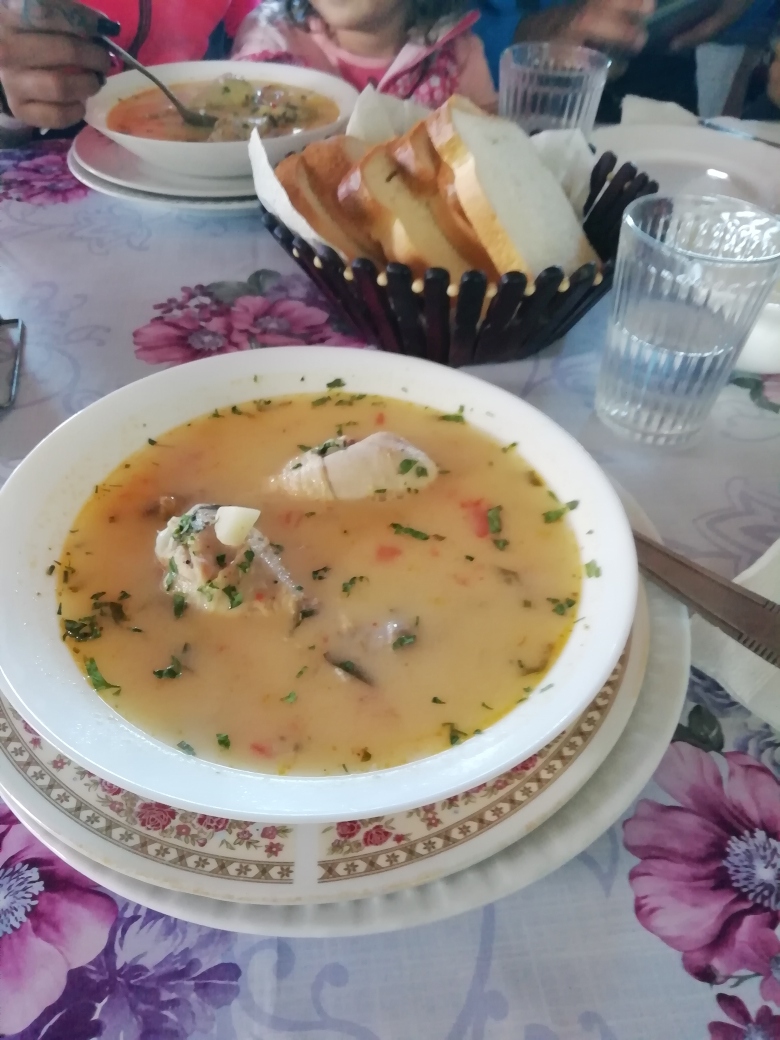 Dann gibts Essen. Vorher bestellt, Chicken oder Fisch. Besser Chicken wegen der Gräten. Erst eine Vorsuppe mit Chicken, dann noch richtig Chicken, alles super lecker. |
