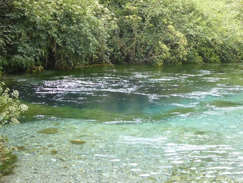 Das "Blaue Auge" ist ein Karstquelle, die in einer unbekannte Tiefe entspringt und das Wasser durch die enthaltenen Mineralien blau und grün färbt. Sehr schön anzusehen und für etliche Besucher auch ein Freibad! Doch bei der Wassertemperatur von gerade einmal 12 Grad kostet das Hineinspringen doch etwas mehr Überwindung. |