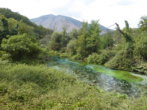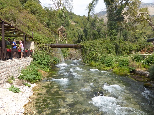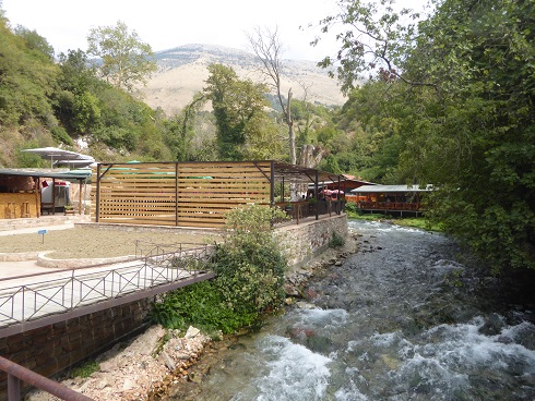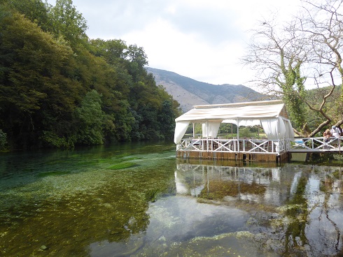 Von Ksamil gelangt aber mit dem Auto auch bequem zu einem echten Naturwunder, dem "Blue Eye", albanisch "Syri i Kaltër" 47 km entfernt. Dazu fährt man zunächst Richtung Gjirokaster, von der Landstarße aus liegt es dann linker Hand. Für 100 Lek darf man über eine Brücke fahren und gelangt dann zu wilden Parkmöglichkeiten, übersäht mit Autos und Bussen. Außer dem "Blauen Auge" gibt es die übliche Touristenlandschaft, Andenkenshops und Kneipen. |