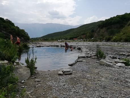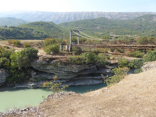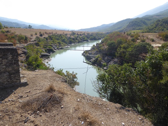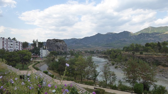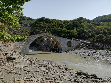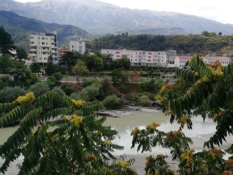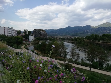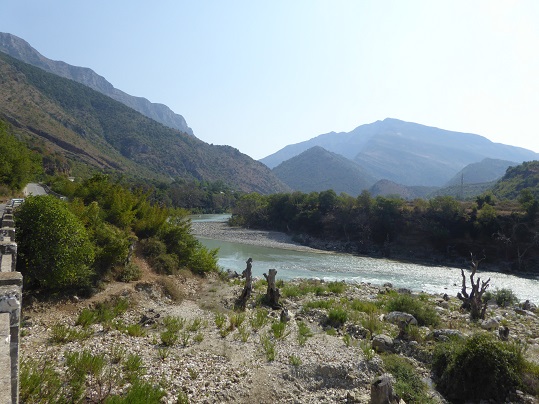 Gleich am Eingang von Permet am Ufer des Vjosa steht das Wahrzeichen Permets der Stadtfelsen. |