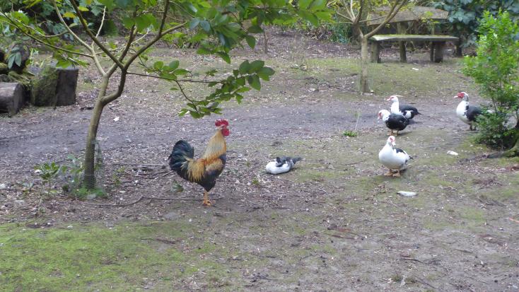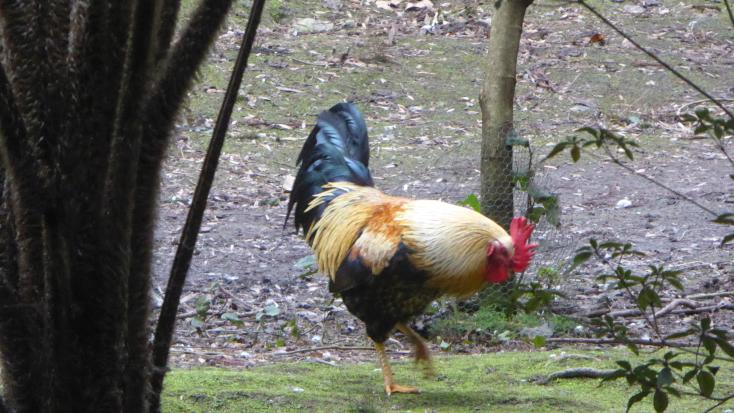 Überall auf Sao Miguel picken Hühner herum, scheinbar frei. Herausragend sind die bunten Hähne. |