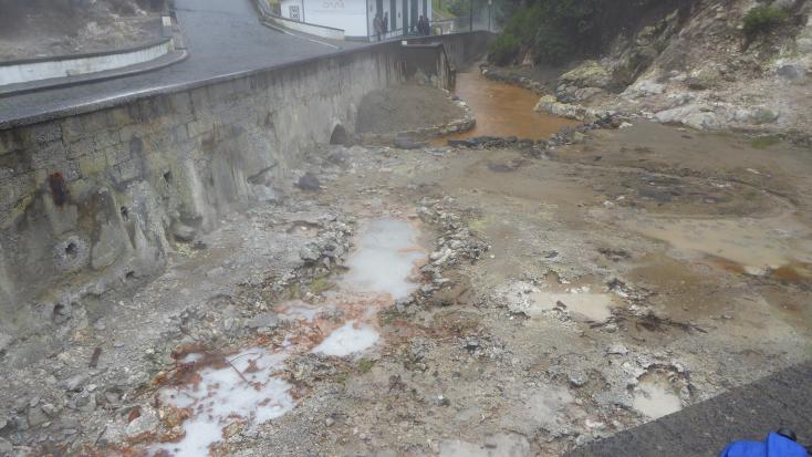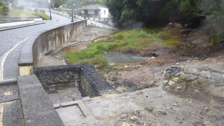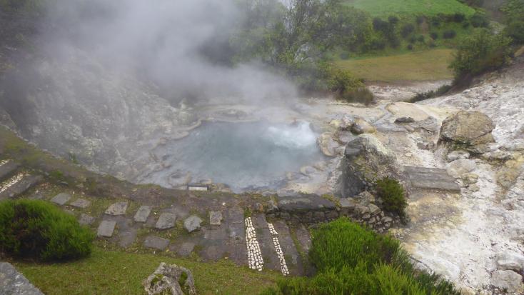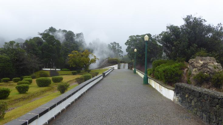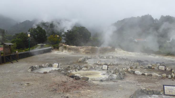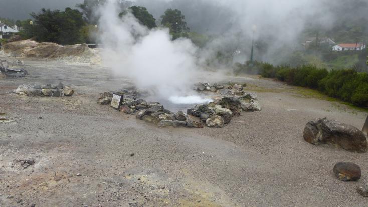 ![]() Nach dem Parkbesuch versuche ich am See weiter zu laufen. Das endet dann infloge des Regens. Aber einen Blick auf diesen seltsam gewachsenen Baum kann dann doch noch werfen. Ich fahre weiter Richtung Furnas. Aus dem kleinen Ort steigt weißer Dampf auf. Er stammt aus den vielen mehr oder weniger großen "Caldeiras" (Kessel). Kein Eintritt, keine Parkgebühr, dafür jede Menge kochendes Wasser und Schwefelgestank, beeindruckend. Die traditionelle Methode der Speisenzubereitung besteht in Furnas darin, einen Topf in ein Erdloch zu stellen und damit das Gericht von vulkanischer Hitze garen zu lassen. So etwas ähnliches habe ich auch auf Neuseeland in der Nähe von Rotorua gesehen. |