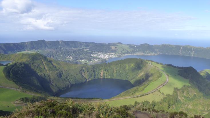 | Im Westen von Sao Miguel liegt eine Anzahl von Kraterseen darunter der "Lagoa Azul" mit dem berühmten Azorenblick. Eine knappe halbe Stunde Fahrt von Ponta Delgada Richtung Relva und dann rechts abbiegen zum Miradouro do Pico do Carvao. Es gibt verschieden Parkplätze, von denen aus man zu den Kraterseen wandern kann. |