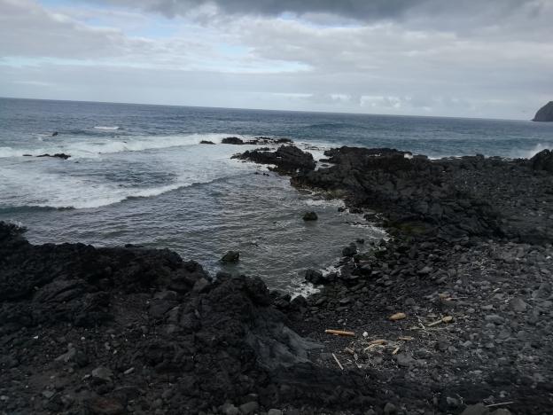 Hier zwischen den schwarzen Steinen strömt das heiße Wasser ins Meer. |
