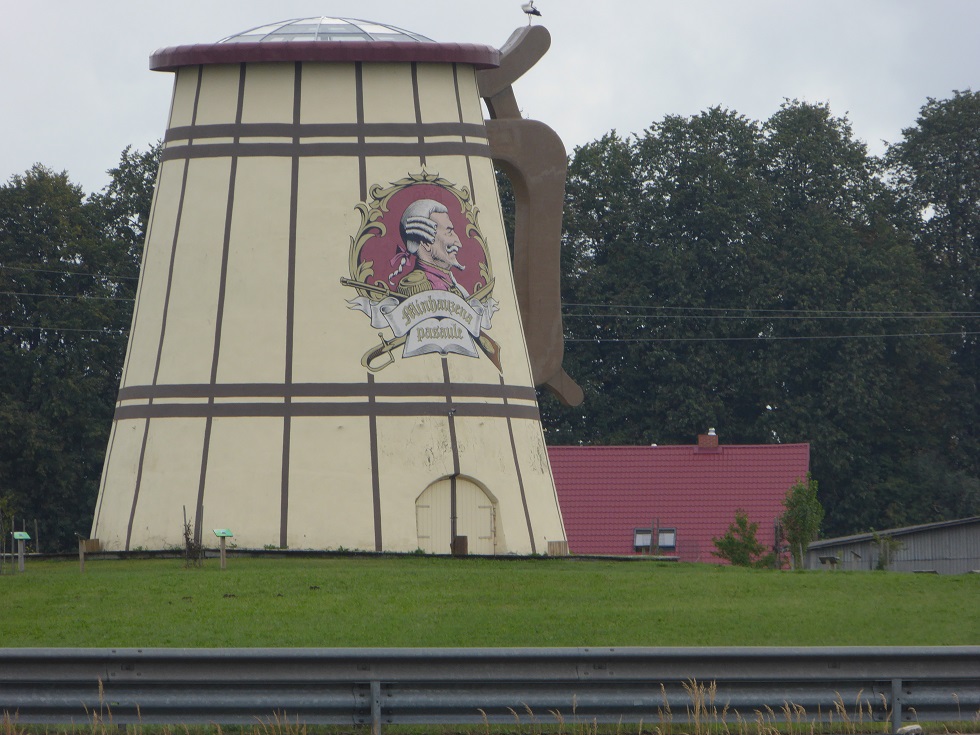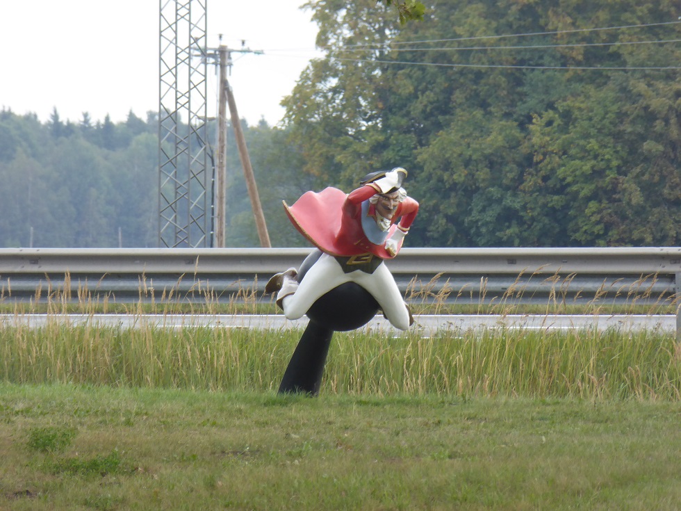 Das Münchhausen, wie alle phantasievollen Mensche, den geistigen Getränken nicht abgeneigt war zeigt uns dieses 7 m hohe Denkmal. Münchhausens Frau starb mit 74 und er heiratete die 17-jährige Bernhardine. Die hatte nur Geld und jüngere Männer im Sinn. Sie verließ ihn schließlich, nicht die schlechteste Lösung, und erstarb mit 77 ohne Geld. Nach diesem interessanten Besuch geht im Auto, nicht auf der Kanonenkugel, weiter nach Ventspils. Unterwegs gt noch der Küstenort Saulkrasti. Ich habe aber keine Lust auf einen Abstecher zu diesem sicher sehr schönen Badeort, denn das Wetter spielt heute nicht so richtig mit. Es regnet. Und so geht es in einem Ritt nach dem 188 km hinter Riga liegenden Ventspils. |