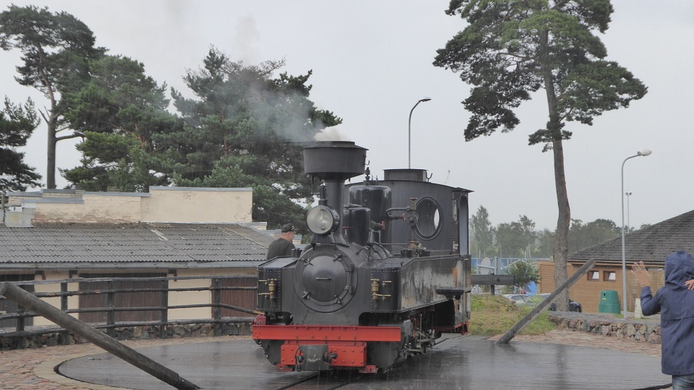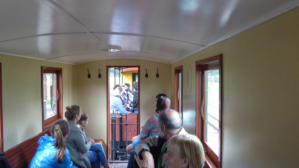 Kleinbahnfahren. Die Dampflok transportiert uns auf einer etwa 5 km langen eingleisigen Strecke. Dann muss sie drehen, sie kann vielleicht nicht rückwärts, wird am anderen Ende des Zuges wieder angekoppelt und fährt zurück. Die zum Drehen notwendige Drehscheibe ist natürlich muskelbetrieben. |