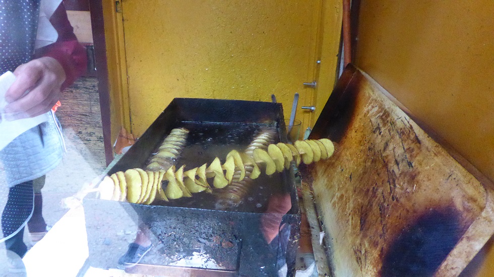 den etwas unter die Lupe zu nehmen. An einem Kiosk mache ich eine Entdeckung. Hier wird eine Kartoffel mit einem Messer zu einer Schnecke geschnitten, dann auf einen Holzspieß gesteckt und frittiert. So eine Art endloser Kartoffelchip. |
