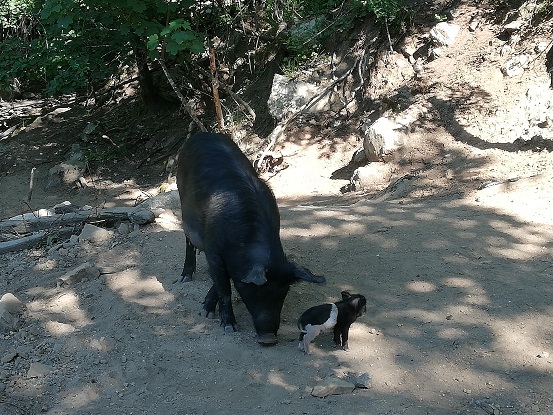 Unterwegs auf der Rücktour dann immer wieder die Schweine, die hier in einem sehr weitläufigen Gatter gehalten werden und sich gesund ernähren. Wir passieren einen Bach. |