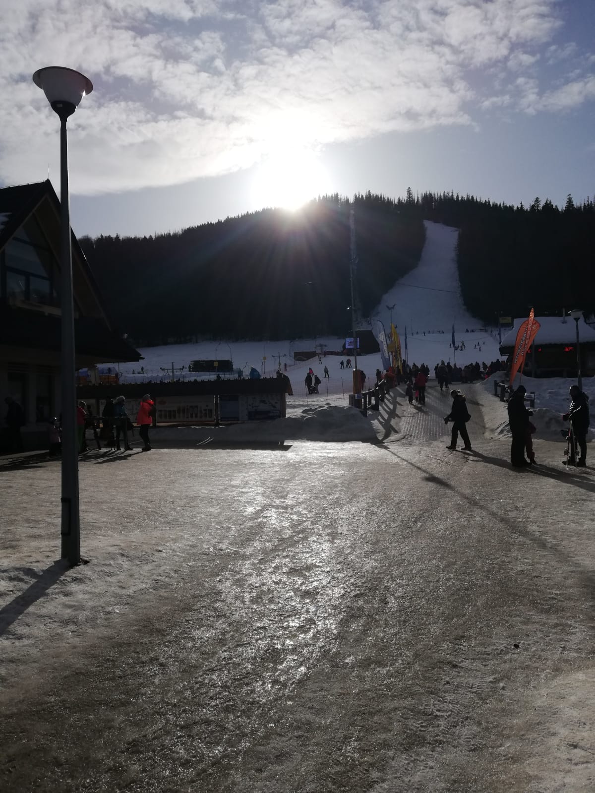 Wir machen ein paar Ausflüge in die Stadt und verschiedene interessante Punkte in der Umgebung. Oben links, eine Abfahrt mit Lift, leider wenig Schnee, aber dennoch Betrieb. Oben rechts, das Nachbarhotel. |