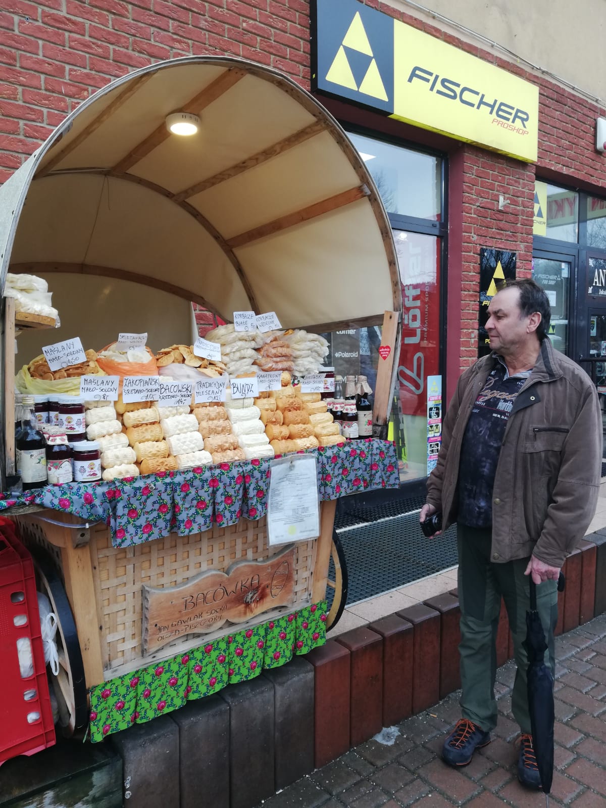 ![]() Überall in der Region wird Käse, meist in geräucherter Form angeboten. Links im Bild. |