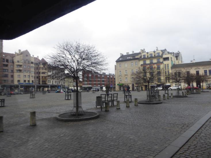 Am heutigen Platz der Ghettohelden, dem damaligen Platz der Einheit (pl. Plac Zgody), befand sich eins der vier bewachten Tore zum Krakauer Ghetto. Nachdem man die Juden zusammengetrieben hatte wurden Appelle und Selektionen abgehalten. Von hier gingen die Juden zur Deportation in die Konzentrationslager. 33 der Metallstühle sind übergroß, stehen auf einem leicht schwebenden Podest und werden nachts von unten angestrahlt. Sie stehen in Reih und Glied über den Platz verteilt und sind Richtung der ehemaligen Apotheke ausgerichtet, die sich direkt am Platz befand. Diese Apotheke war der einzige "Draht" nach außen für die Bewohner, weil der Apotheker mit den Insassen kooperierte. |