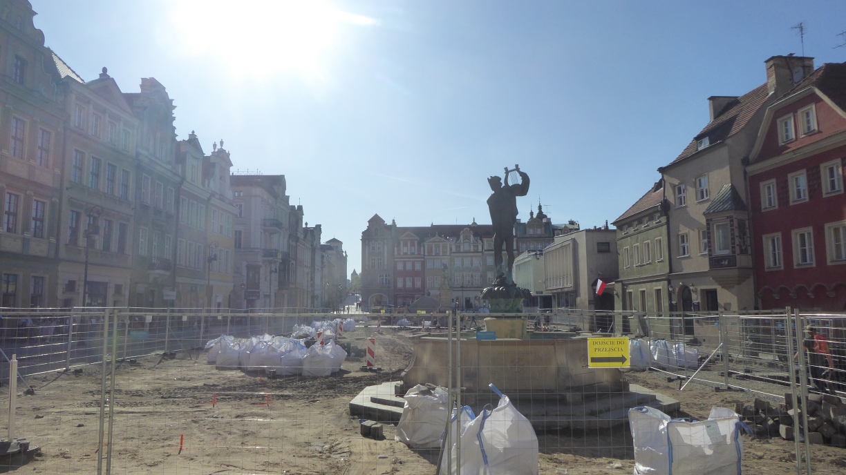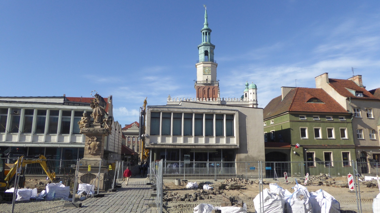 Der alte Markt mit dem Alten Rathaus (rechts) steht schwer unter Restauration, wie vieles in Polen. |