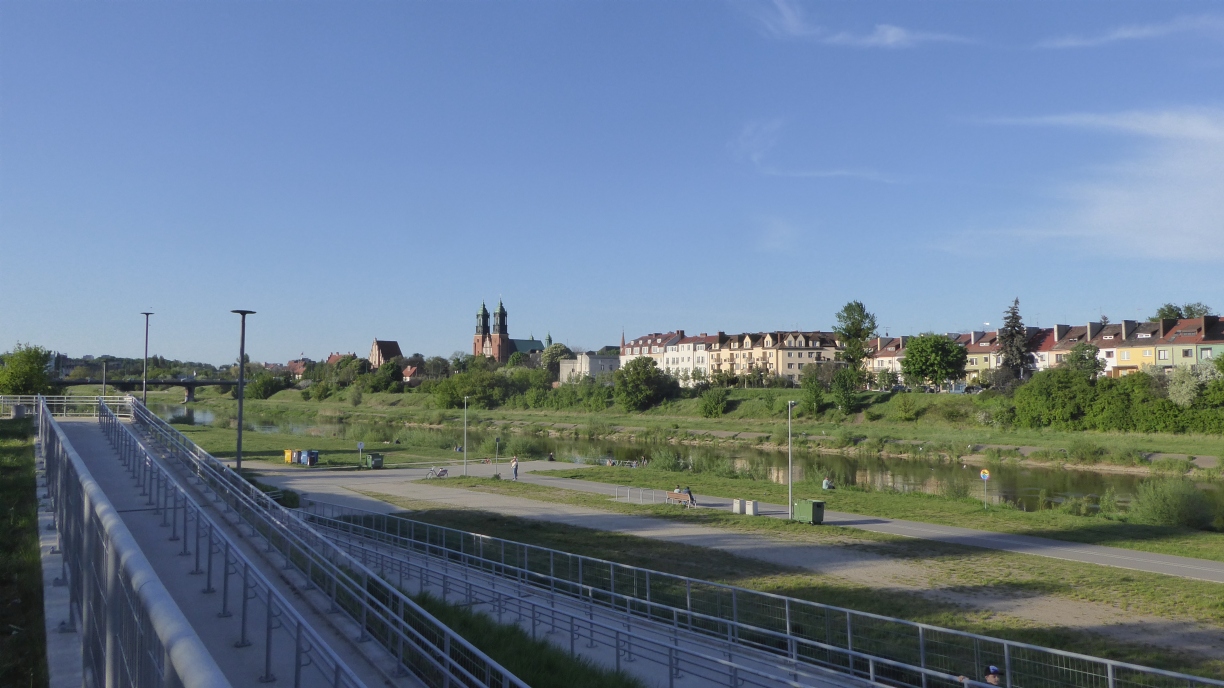 Hier führt die Bischof-Jordan-Brücke über die Warte. Am Ufern reges Treiben mit Grillständen und Getränken aller Art. Im Hintergrund rechts der Posener Dom, Sitz des Bischofs seit dem Mittelalter. |