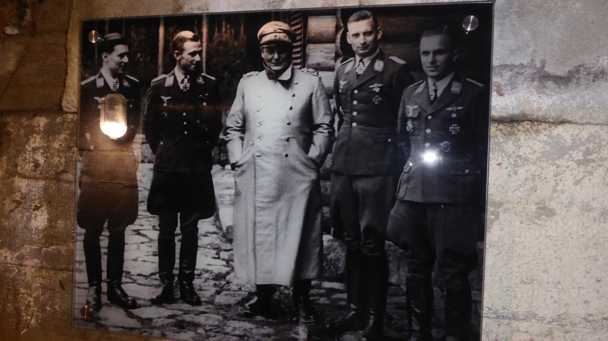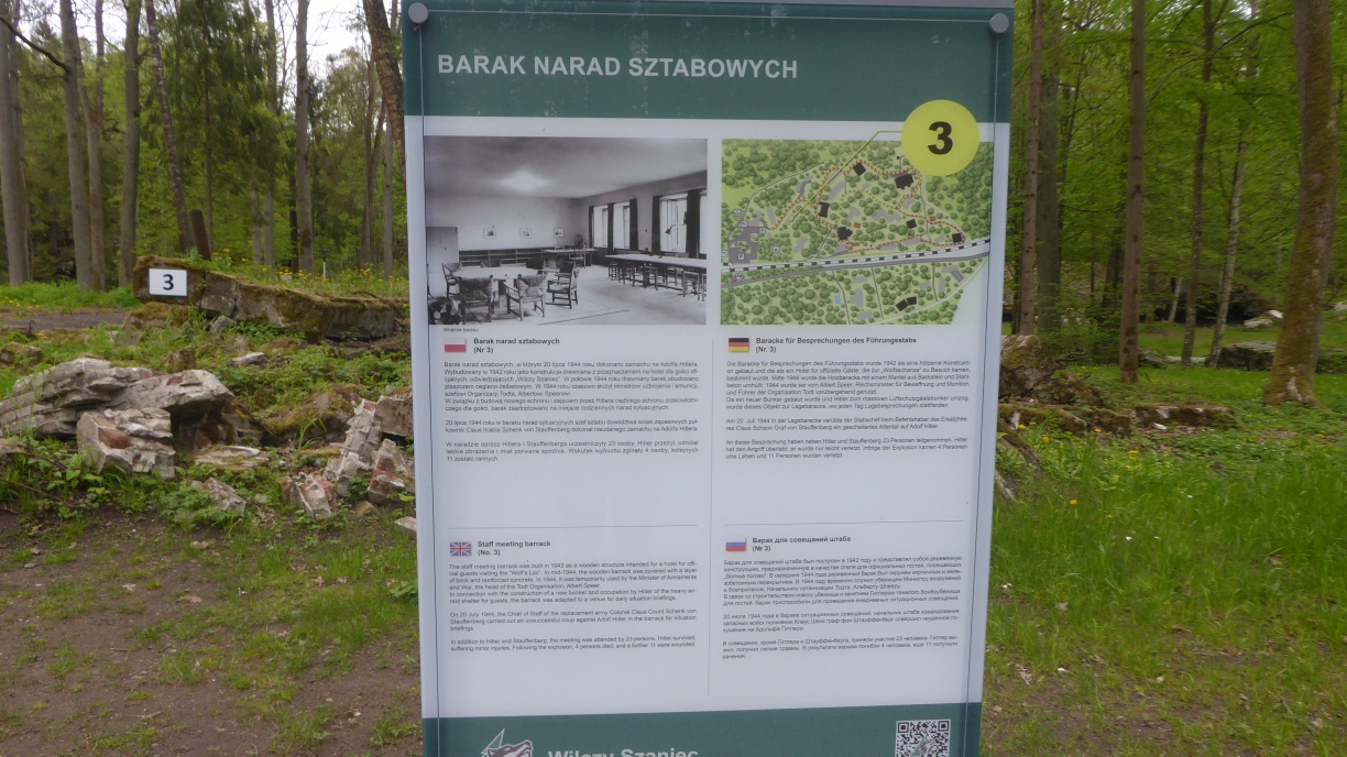 Die Reste der Beratungsbaracke. Hier fand im Juli 1944 das Attentat auf Hitler statt. Die Decke eines gesprengten Bunkers. Manche Decken waren bis zu 7 m dick. Der Gästebunker. Hier wurden Persönlichkeiten des NS-Regimes, aber auch Gäste untergebracht. Insgesamt wenig genutzt. Besucher des Gästebunkers. Hier die Darstellung der Vorgänge im Besprechungsbunker. In der Verlängerung der Füße von Hitler befindet sich in der Mitte des Tisches ein Stütze aus Holz. Die hat den Tod des Diktators verhindert. |