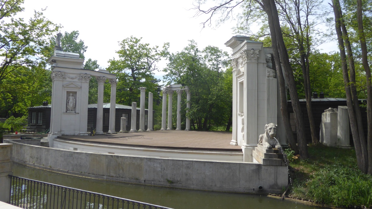 Das Theater auf der Insel wurde 1790 von Jan Chrystian Kamsetzer auf einer künstlichen Insel im südlichen Łazienki-See nach dem Vorbild des antiken Theaters von Herkulaneum errichtet. Die mit antiken Ruinen und Statuen ausgestattete Bühne befindet sich auf dem Wasser. Die Zuschauerränge sind durch den Łazienki-See von der Bühne getrennt. |