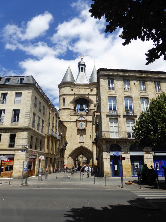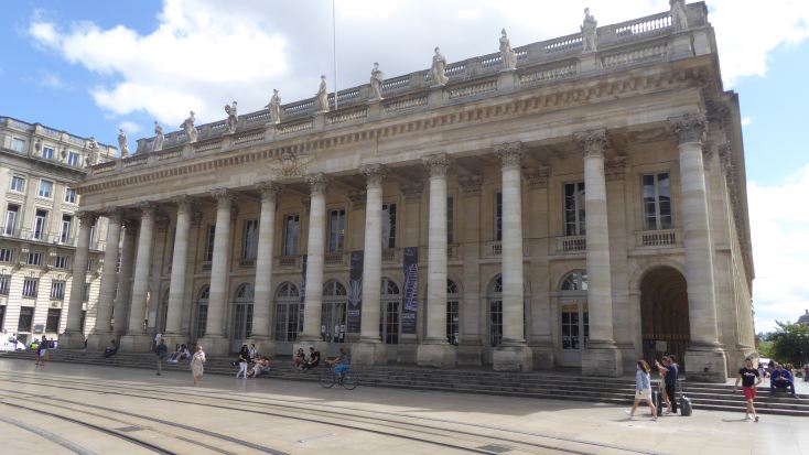 Das Grand Theatre am Place de la Comedie. Eingemauert, die Kirche "Grosse Cloche" in der Rue St. James. |