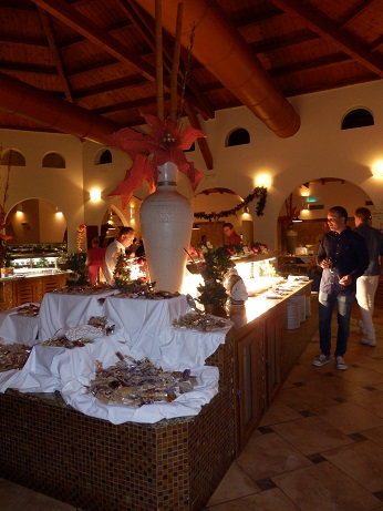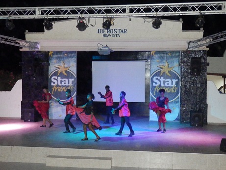 Ein Highlight ist das große Restaurant. Daneben gibt es noch zwei kleine. Hier wird gefrühstückt und abends gibt es ein oppulentes Buffet. Am Eingang gibt es einen Empfangsdrink, Sekt oder heißer Rum. Rum ist hier auf den Kap Verden ein Nationalgetränk und wird auch hier erzeugt. Mit seinem hohen Alkoholgehalt ist er brennbar, was beim Servieren noch interessanter wirkt. Dass er sehr schnell wirkt kriege ich an einem Abend relativ schnell mit, oder an dem Abend auch nicht. |