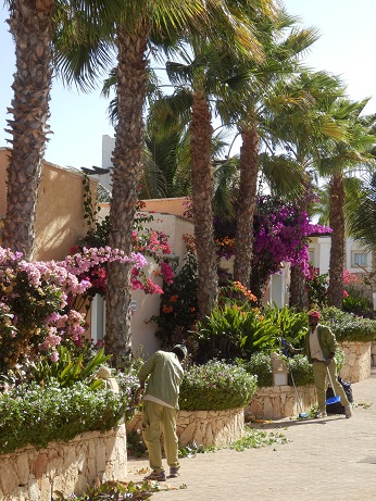 Die Anlage ist sehr schön gestaltet. Außer den verschiedenen Restaurants gibt es noch Shops, eine Fitnessstudio und einen Beautysalon. Für etwa 40 Euro kann man sich auch eine Stunde lang massieren lassen. Gesprochen wird auf den Kap Verden normalerweise porugiesisch, als ehemalige portugiesische Kolonie. Im Komplex geht es auch in Spansich oder Englisch. Als übliche Bezahlung gilt der Euro, obwohl die Nationalwährung Escudo ist. (1000 Escudo = 9 Euro) |