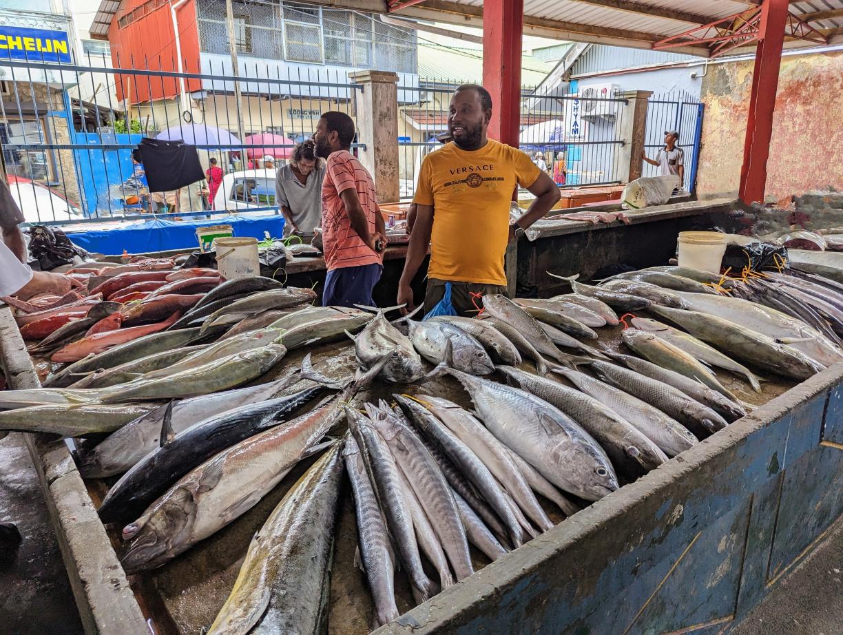 ![]() Interessant und schön ist der Besuch des Marktes. Hier gibt es allerlei Nahrungsmittel, die Hauptsensation ist der Fischmarkt. Es gibt vor allem Thunfische. Thunfische sind auch Exportsäule der Seychellen neben Gewürzen und Kokosartikeln. |