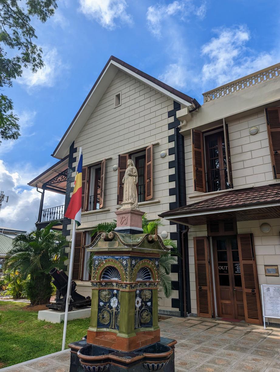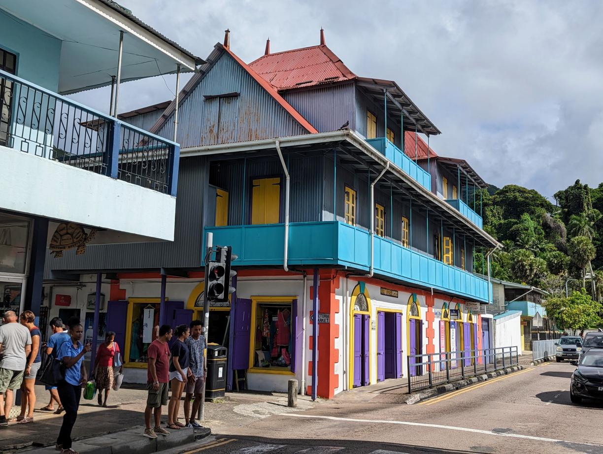 Victoria liegt an der Nordostküste Mahés, von steilen Berghängen eingefasst. Mit etwa 25.000 Einwohnern stellt Victoria die größte Ortschaft und einzige Stadt der Seychellen dar. Ihre Gründung geht auf französische Siedler im Jahr 1778 zurück, von den Briten wiederum erhielt sie ihren Namen, der ihr zu Ehren der Königin gegeben wurde. Links im Bild ist die Kathedrale unserer lieben Frau zu sehen. Daneben gibt es ein Priesterseminar. 80 % der Bevölkerung der Seychellen sind Katholiken. |