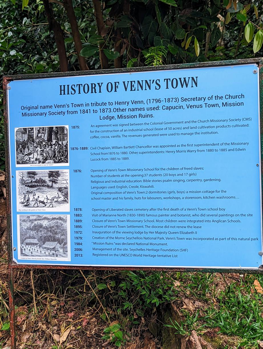 Wir heben eine ganztägige Bustour für rund 100 Euro pro Person gebucht. Zuerst besuchen wir Victoria, die Hauptstadt der Seychellen. Als nächstes geht es in die Berge. Der höchste Berg ragt über 900 m über den Meeresspiegel. Venn's Town, 6 km von Victoria entfernt, hat eine interessante Geschichte, und bietet wunderbare Blicke auf die Bucht vor Victoria. Die Mission wurde 1876 für befreite afrikanische Sklavenkinder eingerichtet. Sie wurden dort untergebracht, bekamen Unterricht und landwirtschaftliches Wissen vermittelt um als freie Menschen ihre eigene Zukunft zu meistern. Heute sind die Ruinen eine mystische Stätte und Erinnerung an ein dunkles Kapitel aus der Zeit des Sklavenhandels. |