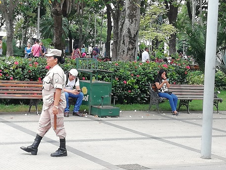 Ab und zu auch interessante Gebäude im Kolonialstil. Dann bin ich plötzlich auf dem zentralen Platz mit der Basilica Menor de San Lorenzo. Wie die meisten zentralen Plätze in Südamerika hübsch gestalten und gut bewacht. |