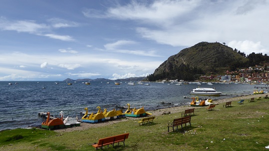 Copacabana ist quasi eine Hafenstadt. Aber nur für kleiner Boote zum Fischen und für die Touristen. Alles ist auf Tourismus eingestellt, es gibt unzählige Geschäfte, Märkte und Restaurants. Und am Wochenende ist auch richtig was los. Da kommen Touris von Peru herüber und Touris fahren nach Peru hinüber. |